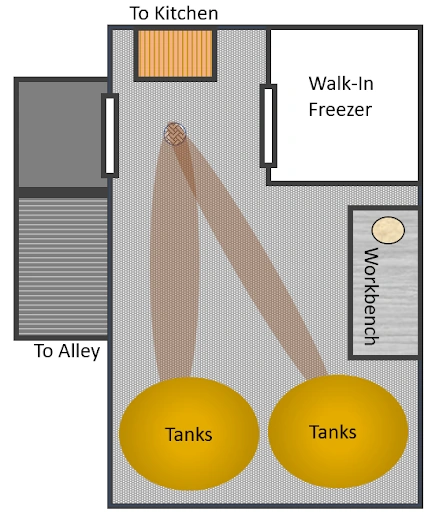 Doorway at end of hallway leads to a velvet-lined room with dark colored, mellow lighting. The room’s air is heavy, and agents will immediately feel dizziness. Any agents with DEA or similar background will recognize a vaporizer in the room contains a light narcotic, but has been left running to hot-box this unventilated room.