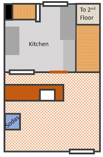 Pizza Kitchen shows signs of after-hours personal use. Main counter with cash register - money from day’s sales still inside. Receipts stuck on a spike under the counter. The gas lines are exposed next to the ovens.